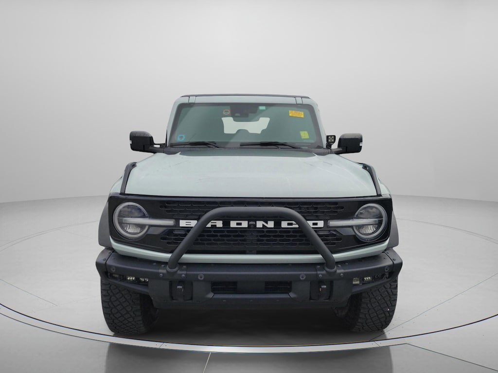 Check out all these options: Ford Gold Certified Certified, Auto High-beam Headlights, Delay-off headlights, Fully automatic headlights, 4-Wheel Disc Brakes, 7 Speakers, ABS brakes, Air Conditioning, AM/FM radio: SiriusXM with 360L, AM/FM Stereo, Brake assist, Brush Guard, Compass, Driver door bin, Driver vanity mirror, Dual front impact airbags, Dual front side impact airbags, Electronic Stability Control, Emergency communication system: 911 Assist, Exterior Parking Camera Rear, Ford Performance Heavy-Duty Modular Front Bumper, Front anti-roll bar, Front Bucket Seats, Front Center Armrest, Front reading lights, Front wheel independent suspension, Heated door mirrors, Illuminated entry, Integrated roll-over protection, Low tire pressure warning, Occupant sensing airbag, Outside temperature display, Overhead airbag, Overhead console, Panic alarm, Passenger door bin, Passenger vanity mirror, Power door mirrors, Power steering, Power windows, Radio data system, Remote keyless entry, Security system, SiriusXM Radio w/360L, Speed control, Split folding rear seat, Steering wheel mounted audio controls, SYNC 4, Tachometer, Telescoping steering wheel, Tilt steering wheel, Traction control, Trip computer, Variably intermittent wipers, and Wheels: 17 Black High Gloss-Painted Aluminum. CARFAX One-Owner. Recent Arrival! 2023 Ford Bronco Cactus Gray 10-Speed Automatic 4D Sport Utility Ford Gold Certified Details: