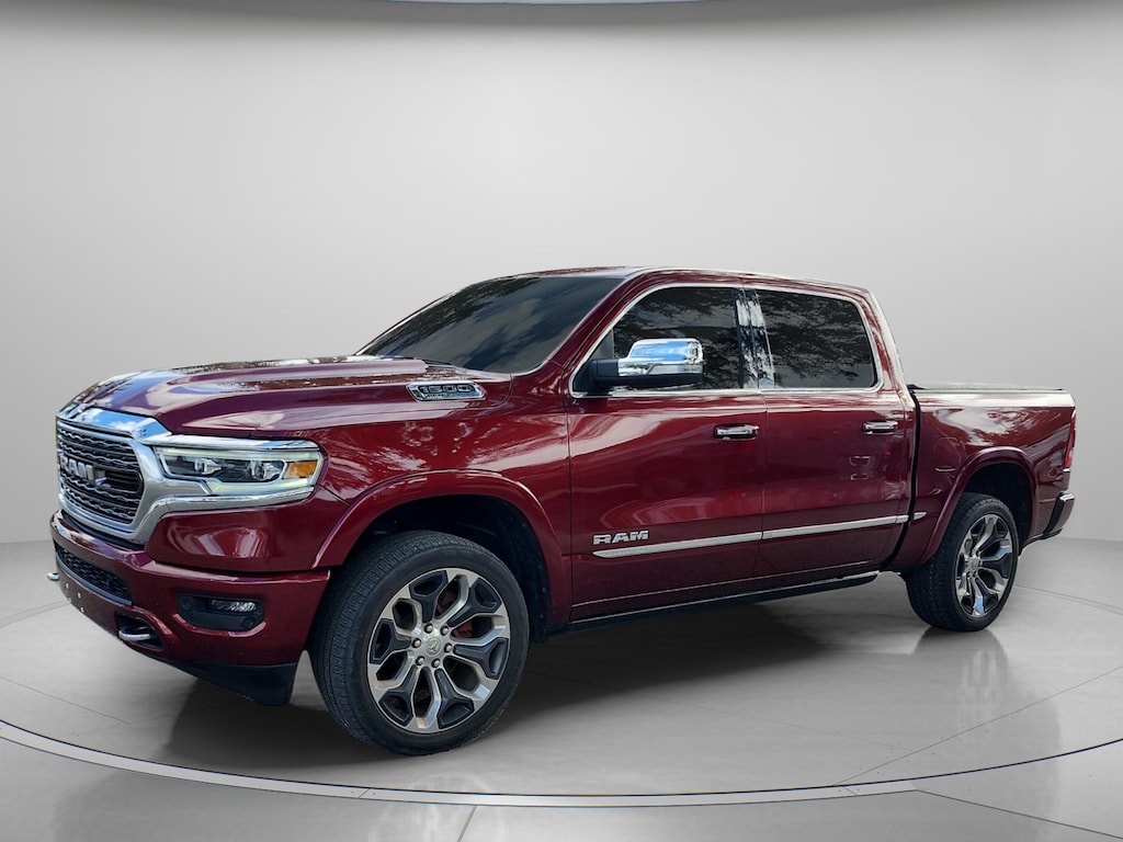 Check out all these options: Body Color Bumper Group, Limited Level 1 Equipment Group, Quick Order Package 27M Limited, Technology Group (Heads-Up Display, LED CHMSL Lamp, and Rearview Autodim Digital Display Mirror), 1-Yr SiriusXM Guardian Trial, 10 Speakers, 4-Wheel Disc Brakes, 48V Belt Starter Generator, 4G LTE Wi-Fi Hot Spot, ABS brakes, Adjustable pedals, Air Conditioning, Alloy wheels, AM/FM radio: SiriusXM with 360L, Anti-Spin Differential Rear Axle, Apple CarPlay, Apple CarPlay/Android Auto, Audio memory, Auto High-beam Headlights, Auto-dimming door mirrors, Auto-dimming Rear-View mirror, Auto-leveling suspension, Automatic temperature control, Bodyside moldings, Brake assist, Bumpers: chrome, Chrome Exterior Mirrors, Compass, Delay-off headlights, Disassociated Touchscreen Display, Dome Dual LED Reading Lamp, Driver door bin, Driver vanity mirror, Dual front impact airbags, Dual front side impact airbags, Dual-Pane Panoramic Sunroof, Electronic Stability Control, Emergency communication system: SiriusXM Guardian, For More Info, Call 800-643-2112, Front anti-roll bar, Front Bucket Seats, Front Center Armrest w/Storage, Front dual zone A/C, Front fog lights, Front reading lights, Front wheel independent suspension, Fully automatic headlights, Garage door transmitter, Genuine wood console insert, Genuine wood dashboard insert, Genuine wood door panel insert, Google Android Auto, GPS Antenna Input, GPS Navigation, HD Radio, Heated door mirrors, Heated front seats, Heated rear seats, Heated steering wheel, Illuminated entry, Integrated Center Stack Radio, Integrated Voice Command w/Bluetooth, Leather steering wheel, LED Dome/Reading Lamp, Low tire pressure warning, Memory seat, Navigation System, Occupant sensing airbag, Outside temperature display, Overhead airbag, Overhead console, Panic alarm, ParkView Rear Back-Up Camera, Passenger door bin, Passenger vanity mirror, Pedal memory, Power door mirrors, Power driver seat, Power passenger seat, Power steering, Power windows, Premium Leather Trimmed Bucket Seats, Radio data system, Radio: Uconnect 12 w/Navigation, Rain sensing wipers, Rear anti-roll bar, Rear seat center armrest, Rear step bumper, Rear window defroster, Remote keyless entry, Security system, SiriusXM Radio Service, SiriusXM Satellite Radio, SiriusXM Traffic Plus, SiriusXM Travel Link, Speed control, Split folding rear seat, Steering wheel mounted audio controls, Tachometer, Telescoping steering wheel, Tilt steering wheel, Traction control, Trailer Brake Control, Trip computer, Turn signal indicator mirrors, USB Host Flip, Variably intermittent wipers, Ventilated front seats, Voltmeter, Wheels: 20 x 9 Polished w/Inserts, and Wheels: 22 x 9 Polish/Painted w/Inserts. 2021 Ram 1500 Delmonico Red Pearlcoat 8-Speed Automatic 4D Crew Cab HEMI 5.7L V8 Multi Displacement VVT RWD